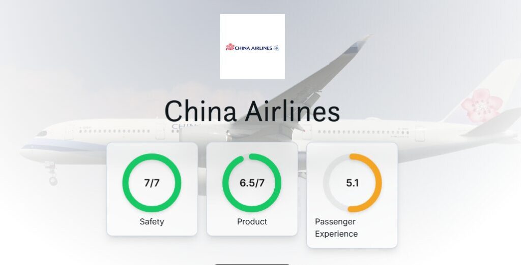 世界的な航空安全評価機関「AirlineRatings.com」では、最新の安全度ランキングで高評価を獲得。China Airlines がこの評価サイトで「Safety=7/7」という最高評価を獲得しています。この「7/7」評価は、事故の少なさ・監査(audits)通過・致命的事故(fatalities)がないことなどを基にしています。